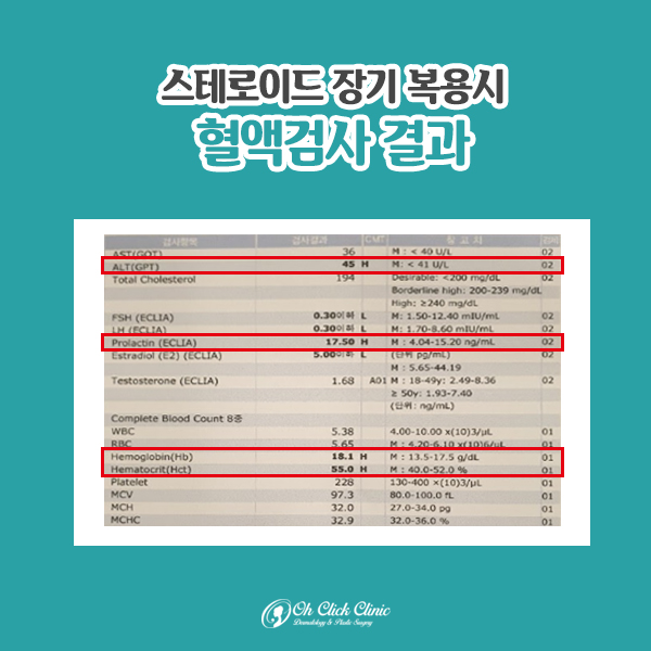 위 이미지는 스테로이드 장기 복용한 한 남성 분의 혈액검사 결과입니다. 혈액검사 결과를 보면 간수치 ALT(GPT)가 증가한 것을 볼 수 있습니다. ALT(GPT)가 증가하게 되면 간염, 간질환의 위험이 높아집니다. Prolactin 수치 증가는 남성의 성기능, 성욕을 감소시키며 Hemoglobin(Hb) 헤모글로빈은 적혈구 속에 들어있는 색소 단백질로 체내의 여러 조직에 산소를 운반하는 역할을 하는데 헤모글로빈의 수치가 높아지게 되면 간암, 심질환의 위험이 높아집니다. 마지막으로 Hematocrit(Hct) 헤마토크릿의 수치 역시 높아진 것을 볼 수 있습니다. 헤마토크릿의 수치가 증가하게 되면 혈액의 두께가 증가하여 작은 혈관을 통과해 조직에 도달하는 능력이 저하되면서 뇌졸중, 심장질환의 위험이 증가하게 됩니다.