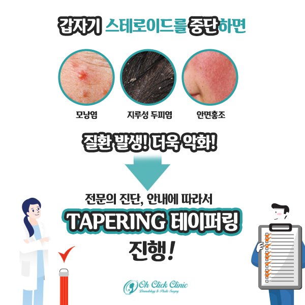 갑작스런 스테로이드 중단은 기존 질환을 더욱 악화시킬 수 있습니다. 이를 스테로이드 반동현상(Rebound phenomenon) 이라고 말하는데요. 스테로이드를 2주이상 어느 정도 장기간 사용하다가 한순간에 확 끊어버리면 스테로이드에 의존해 왔던 기존 전신질환은 물론 모낭염, 지루성 두피염, 안면홍조 등 평소 자신이 가지고 있던 피부질환이 악화됩니다. 그렇기 때문에 스테로이드를 끊으실 때에는 의사의 진단과 안내에 따라서 점차 강도를 줄이고 주기를 길게 잡으면서(Tapering 테이퍼링) 끊어주면서 반동으로 생기는 증상들을 치료해야 합니다. 내 몸이 스테로이드가 중단되는 것에 대해서 적응이 필요합니다.